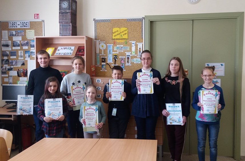 Balandžio 27 d. progimnazijos bibliotekoje vyko tradicinio skirtukų konkurso nugalėtojų bei bibliotekos rėmėjų, dovanojusių bibliotekai knygas, apdovanojimas. Nuo kovo 12 iki balandžio 13 d. pirmų aštuntų klasių mokiniai kūrė skirtukus knygoms, patekusioms į sąrašus „Šimtas knygų vaikams ir Lietuvai“ bei „Literatūros žinovų šimtmečio knygų šimtukas“. 128 konkurso dalyviai sukūrė 162 originalius skirtukus 62 pavadinimų knygoms. Daugiausia skirtukų buvo sukurta knygoms „Salomėja Nėris. Eglė žalčių karalienė“, „Vytautas V. Landsbergis. Arklio Dominyko meilė“ bei „Justinas Marcinkevičius. Grybų karas“. Šiemet, kaip ir pernai, nugalėtojus rinko ne tik komisija, bet ir visi bibliotekos lankytojai. Buvo išrinkta 11 gražiausių darbų: Sofijos Sriubikis (1b kasė.), Gabijos Paužaitės (2e klasė), Kiro Apulskio (3a klasė), Liepos Pauliukonytės (4b klasė), Mykolo Ratkevičiaus (4b klasė), Kornelijos Katkutės ( 5t2 klasė), Ugnės Vasiliauskaitės (6m klasė), Agnės Biliūnaitės (7e klasė), Beatričės Šacikauskaitės (7m klasė), Vaivos Zalecka\itės (8t klasė) ir Rapolo Mato Strazdo (8t klasė).