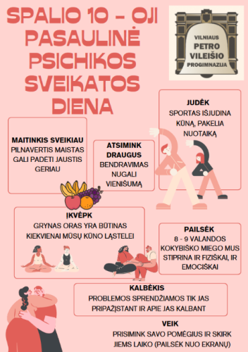 Spalio 10-ąją progimnazijos bendruomenė minėjo Pasaulinę psichikos sveikatos dieną. Šiemet siekėme atkreipti dėmesį į tarpusavio santykių, draugystės, nuoširdžių ir artimų pokalbių svarbą. Dėl to mokykloje tiek mokiniai, tiek mokytojai vykdė ,,Draugystės iššūkio“ užduotis: mokėsi pagirti vienas kitą, išdrįsti užkalbinti nepažįstamą, padėkoti už pamoką, pasakyti komplimentą, pasiteirauti, ar reikia pagalbos, ir daug kitų su santykių stiprinimu susijusių veiklų. Juk rūpindamiesi kitu, rūpinamės ir savimi! Progimnazijos erdvės pasipuošė plakatais su patarimais, skatinančiais atkreipti dėmesį į savo vidinę savijautą.