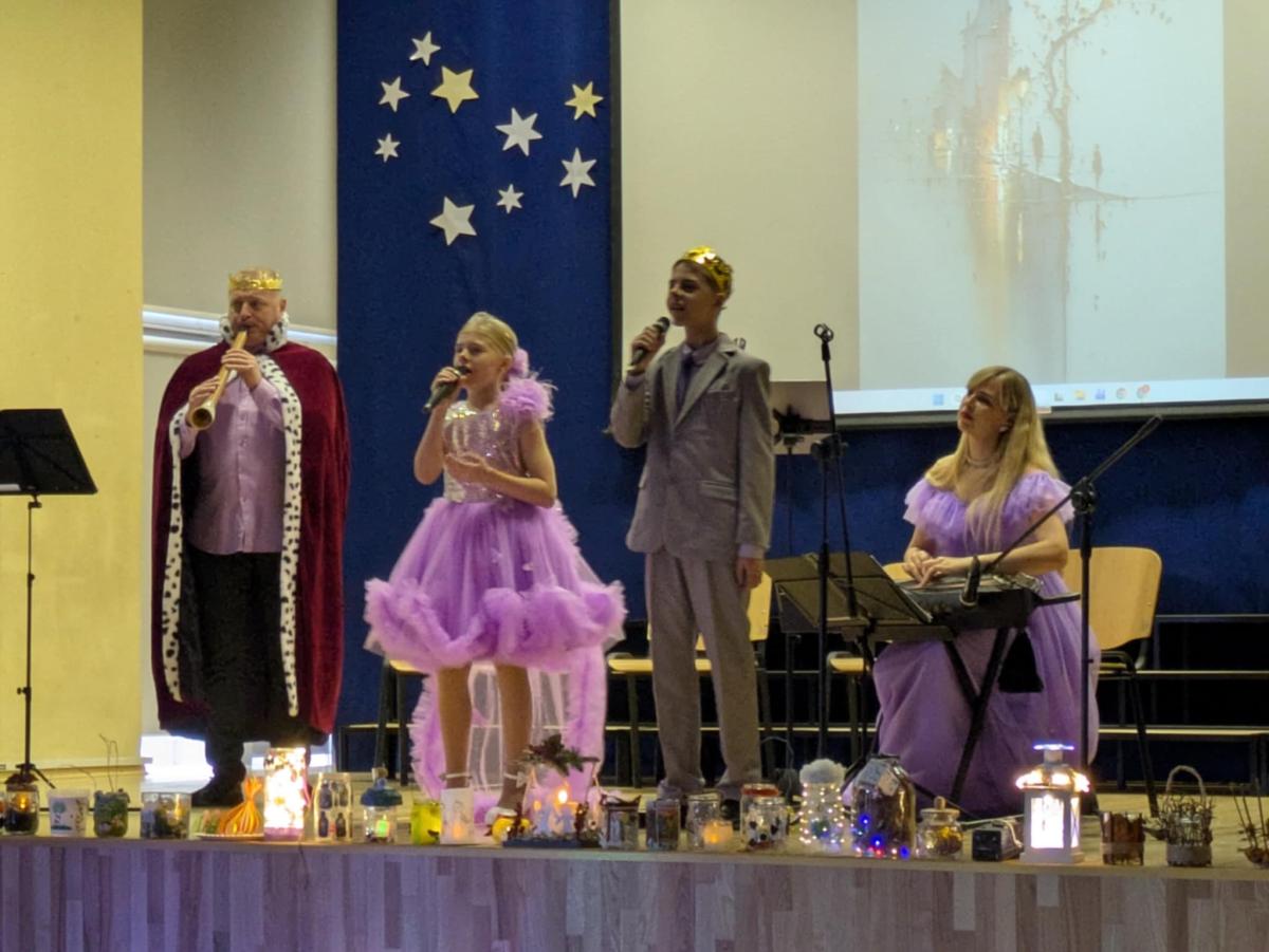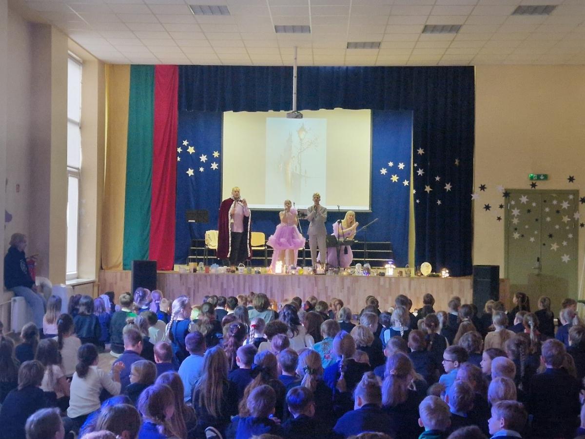 Renginio metu skambėjo muzikinė edukacinė pasaka „Vieną kartą…“. Kanklių garsai (Aistė Bružaitė), birbynės melodijos (Egidijus Ališauskas) bei vaikų – Akvilės (5mt kl.) ir Luko (5m1 kl.) – balsai susiliejo į šviesos ir muzikos istoriją, pasakojančią apie gerumą, bičiulystę ir dalijimosi džiaugsmą. Šis pasirodymas tapo simboline Žibintų ir Gerumo savaitės pradžia. Mokiniai, klausydamiesi pasakos ir muzikos, prisiminė Šv. Martyno dienos prasmę – dalytis šviesa su kitais, skleisti gėrį ir šilumą. Šventinę nuotaiką pratęsė visą savaitę mokykloje vykstanti paroda „Taikos žibintas“. Joje eksponuojami mokinių kartu su tėvais per rudens atostogas pagaminti Taikos ir Gerumo žibintai. Kiekvienas jų – mažas šviesos simbolis, primenantis, kad taika ir gerumas prasideda nuo kiekvieno mūsų.