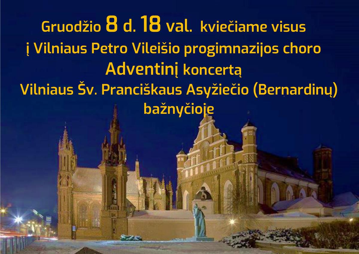 Gruodžio 8 d. 18 val. kviečiame visus į Vilniaus Petro Vileišio progimnazijos choro Adventinį koncertą Vilniaus šv. Pranciškaus Asyžiečio (Bernardinų) bažnyčioje.